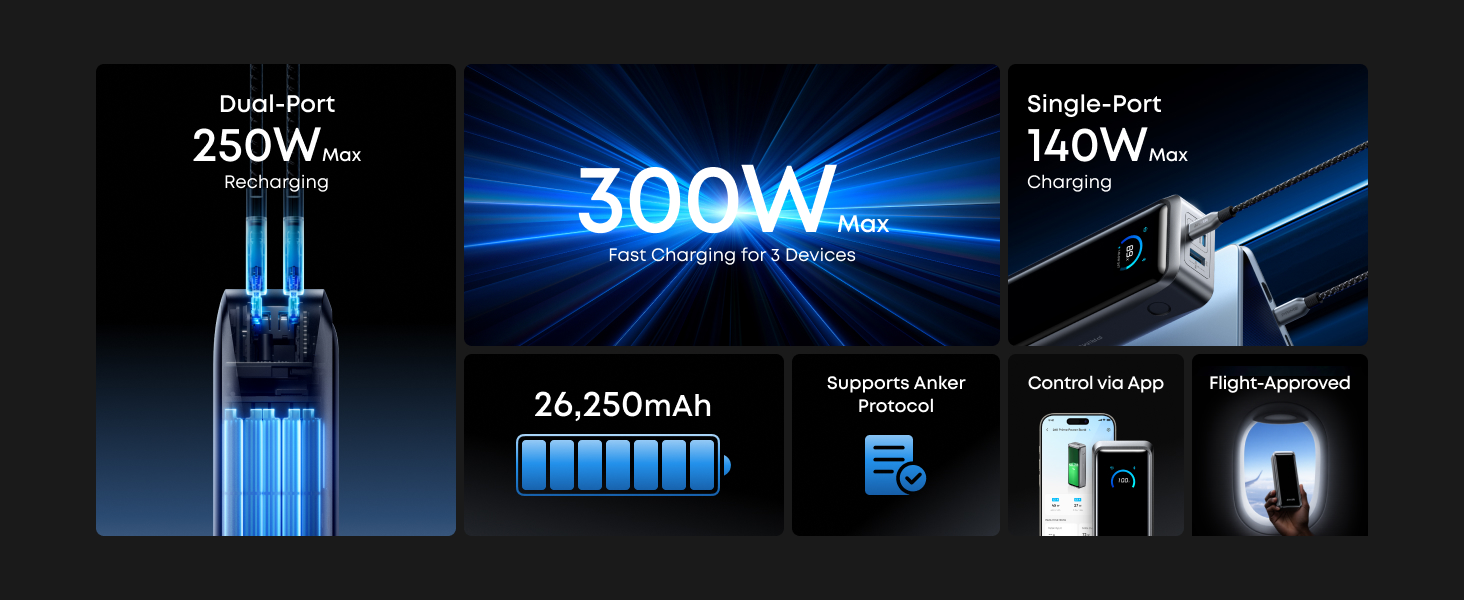 - Recharge at Top Speed: Anker's first power bank to support 250W max of input power using both USB-C ports. Recharge to 100% faster than ever, making it ideal for high-use, fast-turnaround situations.