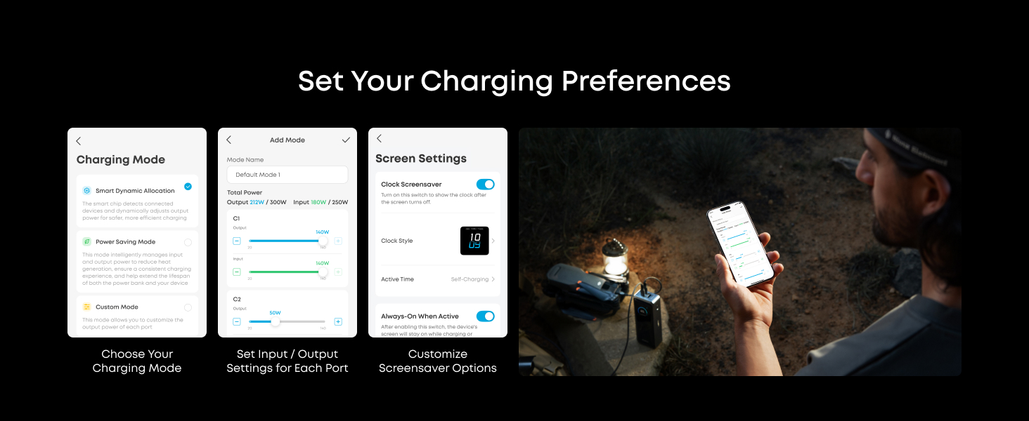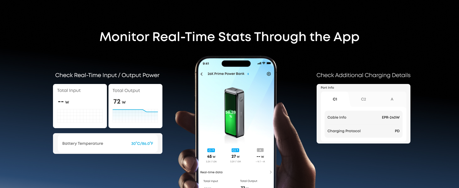 - Smart Display and App Control: Provides detailed charging information of the power bank and charging base, and allows manual adjustments of output power on the APP.