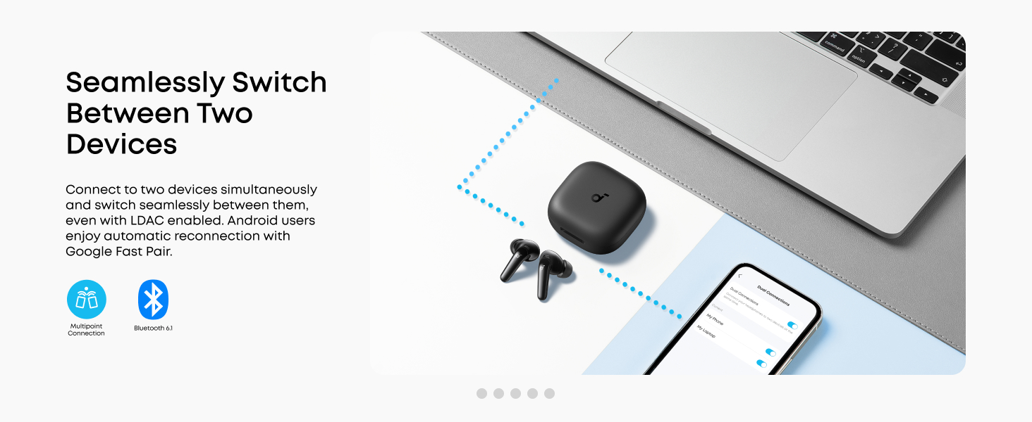 2. In the soundcore app, go to More Settings > Dual Connections > Device List and toggle off your device. Then, tap to select and connect a new device, or hold both earbuds for 3 seconds to enter pairing mode.