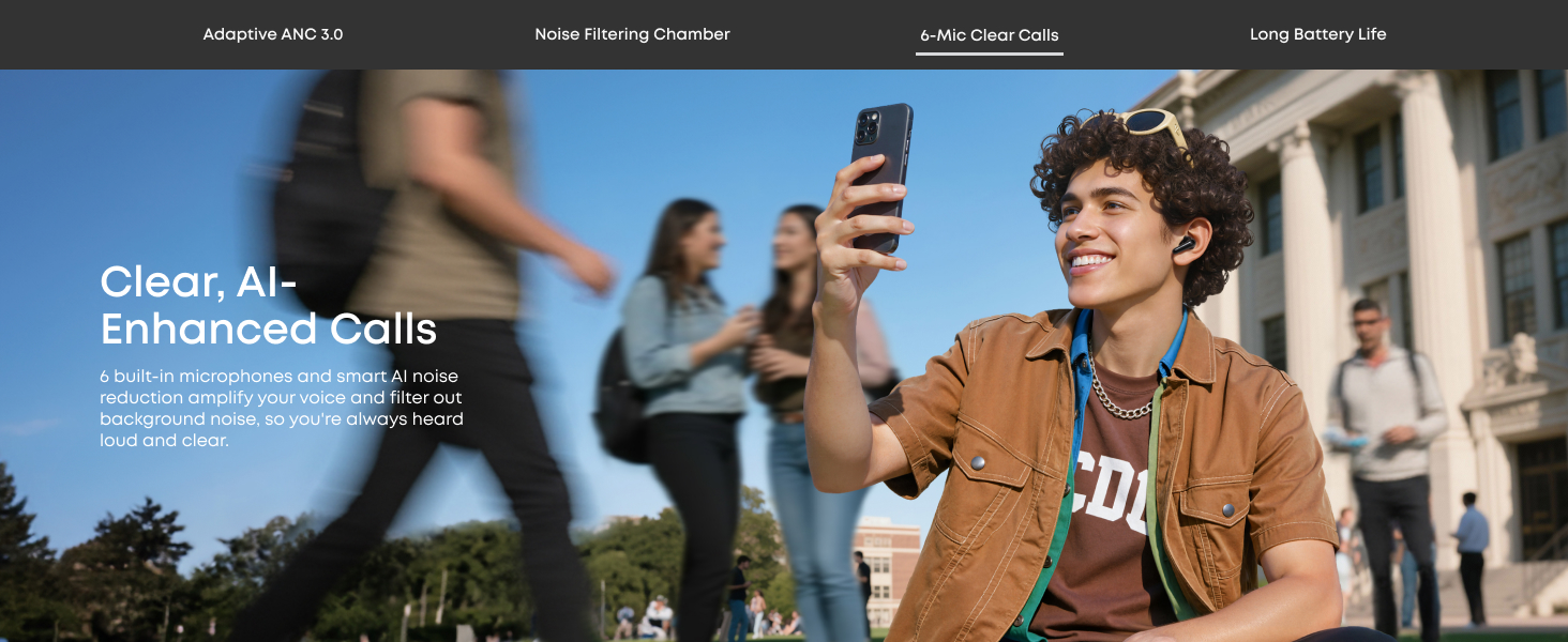 - Crisp, Clear Calls: Six microphones and advanced AI work together to filter out external noise and wind for crystal-clear calls. Be heard loud and clear no matter where you are, for conversations that sound like they're face-to-face.