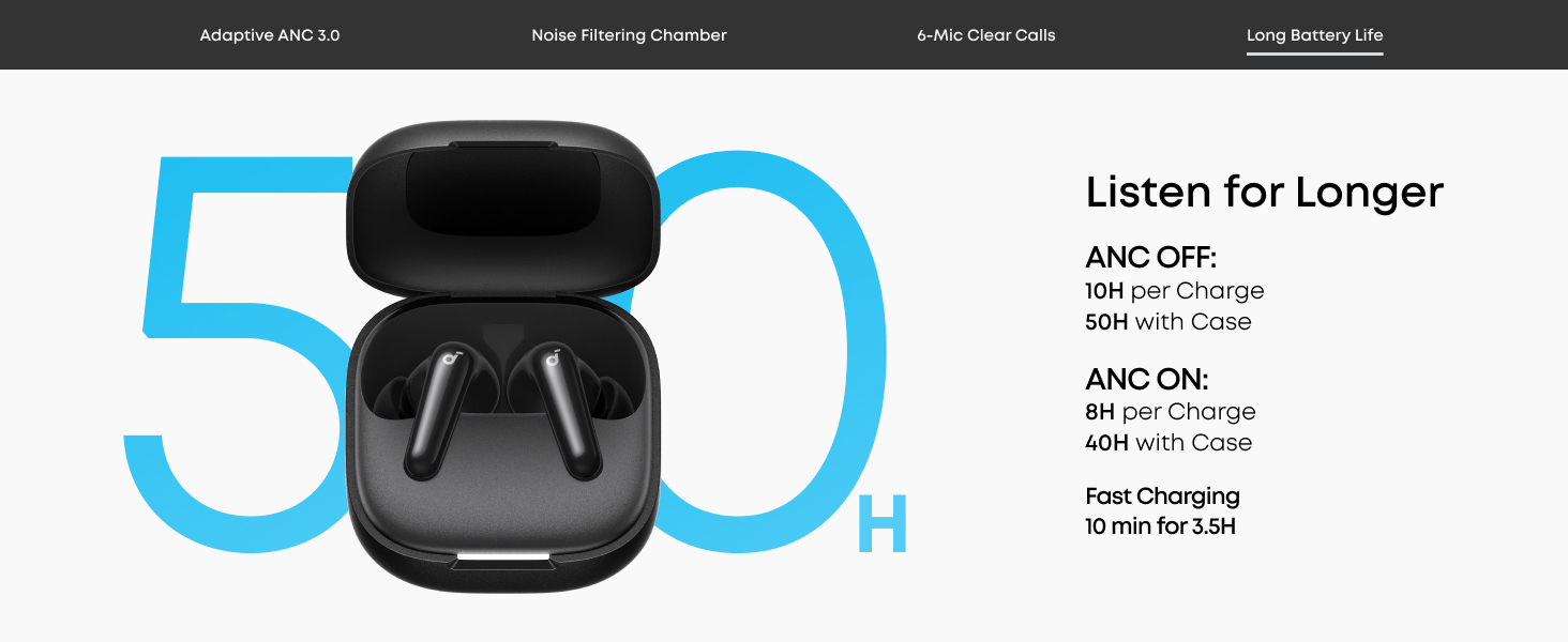 - Listen for Longer: Get up to 10 hours of playtime on a single charge and a total of 50 with the case, with noise cancellation enabled, get up to 8 hours of playtime on a single charge and a total of 40 with the case. A 10-minute charge delivers up to 3 hours of playtime.