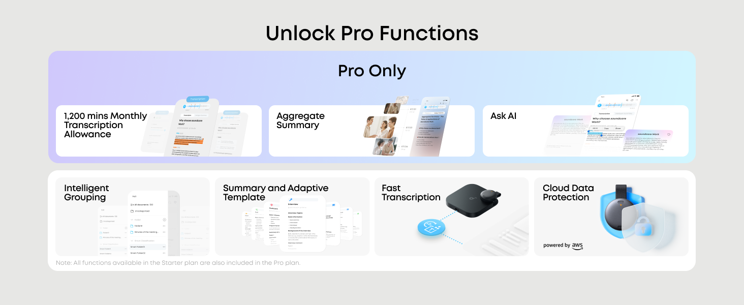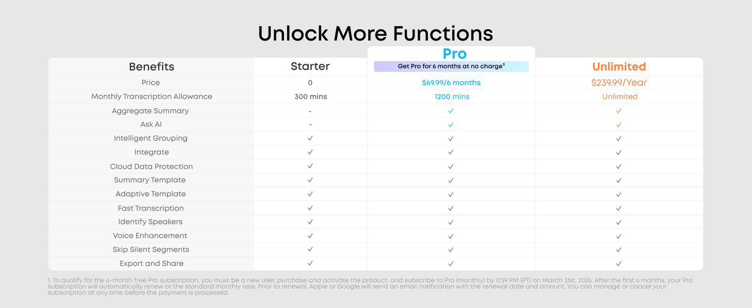 Note:New users who authorize a Pro monthly subscription before 11:59 PM PT on March 31st, 2026, will receive a 6-month free trial. After the trial, the subscription will automatically renew at the standard monthly rate from the 7th month. Users may cancel anytime before the billing date. After connecting the device for the first time, users automatically become Starter members and receive 300 minutes of transcription per month. If a user upgrades to a paid membership, their Starter membership will be paused and will automatically resume once the paid subscription expires.