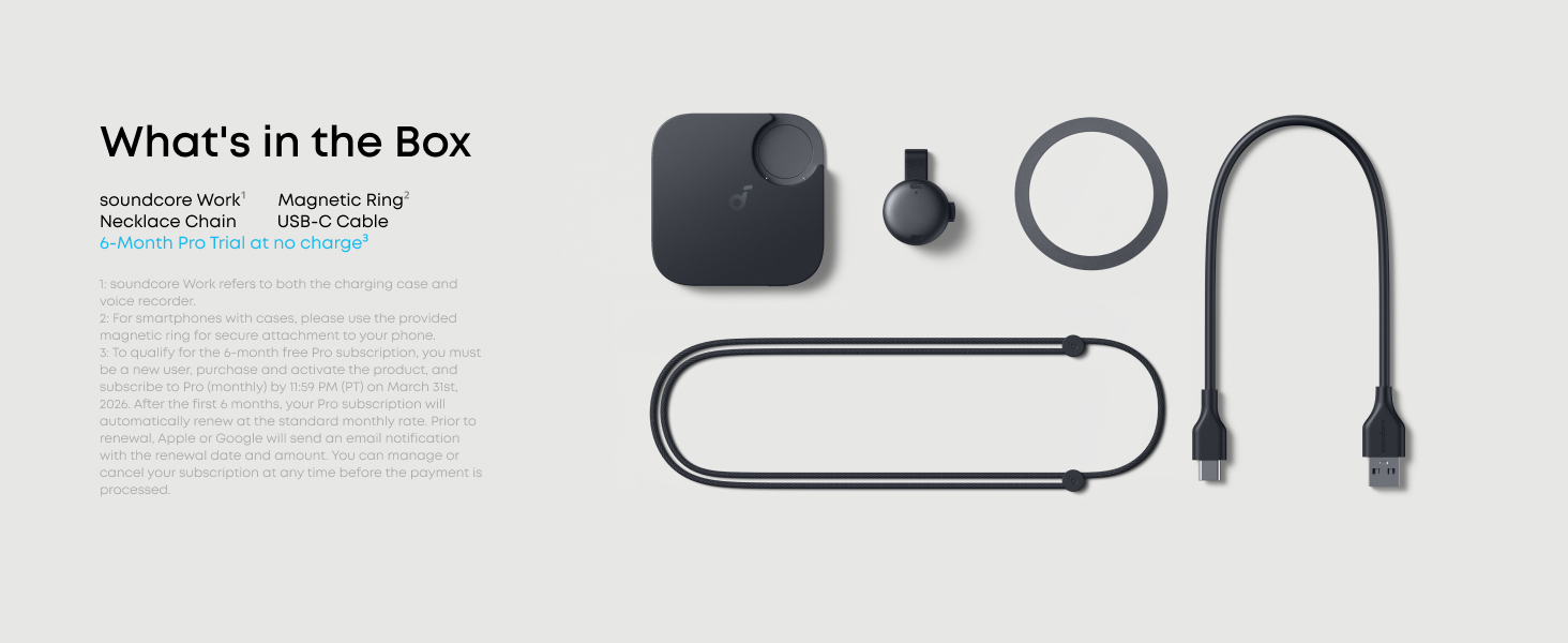 What's in the Box: 1 soundcore Work, 1 USB-C Cable, 1 Necklace Chain, 1 Magnetic Ring. Note: Log in to the app first to connect the device for initial setup.