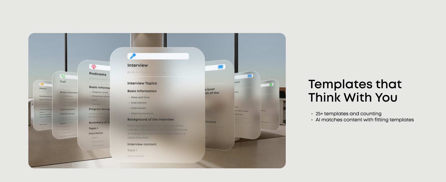 - Intelligent Summarization: Generates structured summaries with templates powered by GPT according to the content of your meetings. The Pro plan lets you manually select summaries from multiple recordings and combine them into a single file.